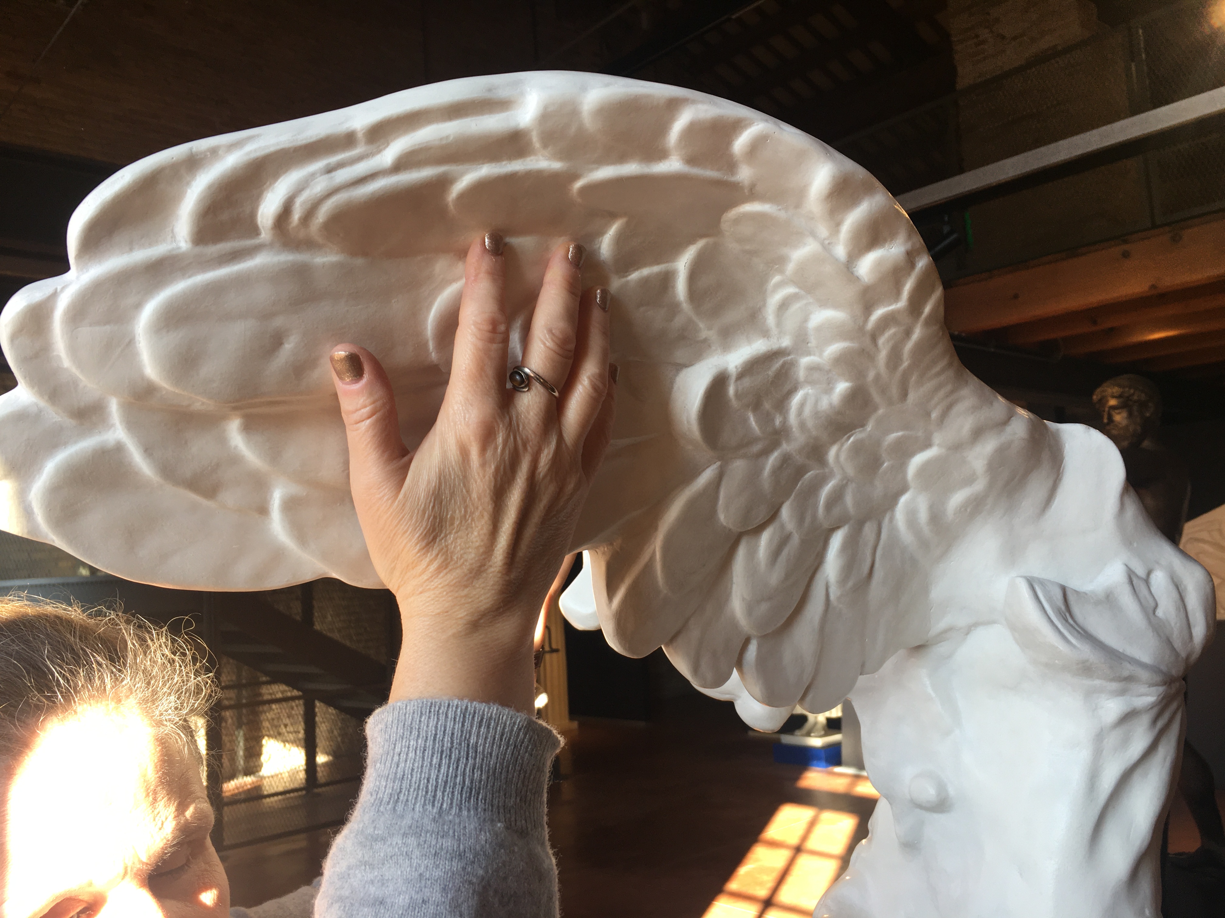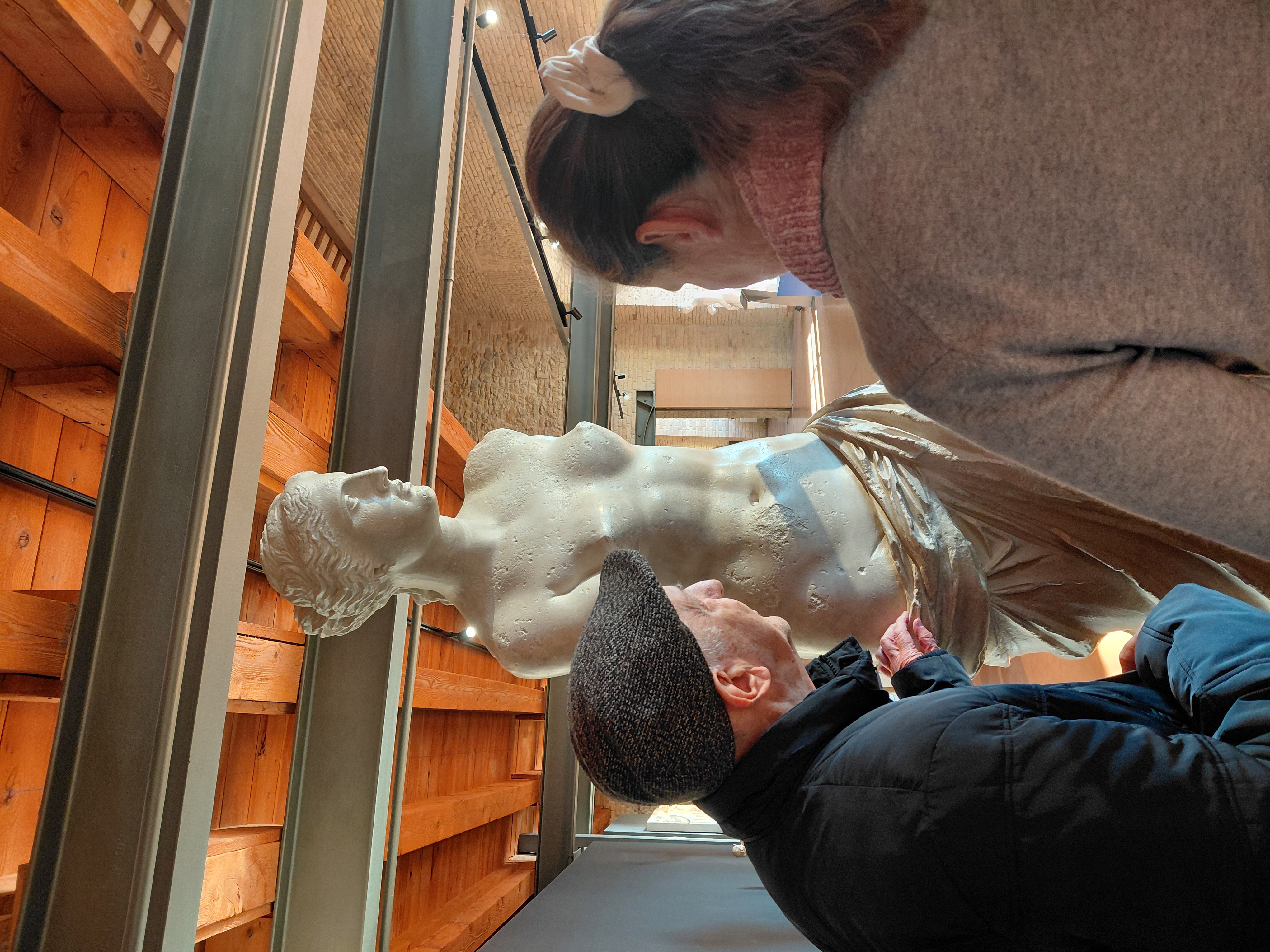 Par ailleurs, sur les conseils d’Enrika, l’une des professionnelles rencontrées pendant la semaine à Padoue, Anne s’est rendue une journée à Bologne. C’est à 1h30 de Padoue en train. Elle y a visité le Musée Anteros dans l’Institut Cavazza pour les aveugles et a pu rencontrer la professeure d’histoire de l’art à l’université de Bologne Dott.ssa Loretta Secchi, fondatrice du musée Anteros. Le musée regroupe des reproductions de célèbres chefs-d’œuvre en modelage. Anne a ainsi pu toucher une reproduction de La Cène de Léonard de Vinci ou de La Vague de Katsushika Hokusai. « À l’émotion esthétique de toucher des matériaux délicats et subtils s’ajoutait l’émotion personnelle d’avoir directement accès à des représentations d’œuvres du patrimoine mondial », patrimoine mondial dont elle n’avait eu que des descriptions verbales jusqu’alors. La découverte fut accompagnée par les conseils de Simone, recommandé par la Professeure Loretta Secchi, autant érudit en histoire de l’art qu’en connaissances du public aveugle. Simone l’a immédiatement mise en confiance et à l’aise dans la découverte des « tableaux », lui faisant faire des choix personnels et sensibles entre paysages, mythologie ou religion. « Il m’a incitée à poser toutes les questions qui me tenaient à cœur, sans gêne ou peur de me tromper. »