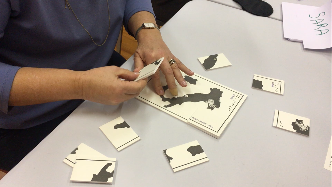 Le SDADV a souhaité faire profiter de ces ateliers à des professionnels de la fondation et à un graphiste extérieur. L’idée était de leur présenter le travail développé depuis un an en France. Les participants ont été mis en situation de lecture tactile dans un contexte connu et familier pour eux. Ils ont ainsi découvert sous bandeau une carte de la silhouette de l’Italie localisant la Vénétie ainsi que le blason de la ville de Padoue spécialement produits pour cet atelier à la fondation. Toujours sous bandeau, les participants ont réalisé un puzzle de la forme de leur pays et se sont exercés au jeu des différences sur des images tactiles. Mathieu et Anne ont pu expliciter les compétences de lecture tactile indispensables à travailler. Ce « public » averti s’est pris au jeu et a accompli les différentes tâches avec enthousiasme et précision.